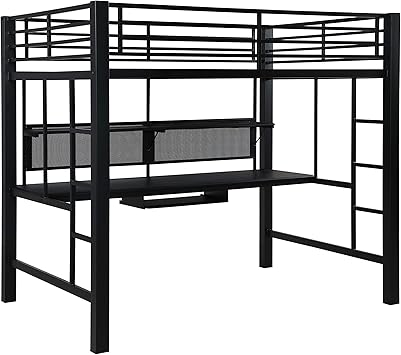 Metal loft bed is finished in black. View details add to brochure. With a large workstation pull-out keyboard tray.