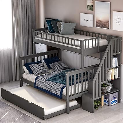 Merax Twin Over Full Stairway Bunk Bed With Storage And Trundle Bed No Box Spring Required Grey Amazon In Home Kitchen