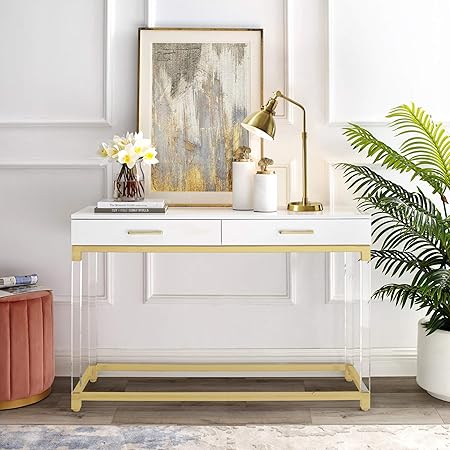 Amazon Com Casandra High Gloss 2 Drawers Console Table With Acrylic Legs And Gold Stainless Steel Base White Gold Kitchen Dining