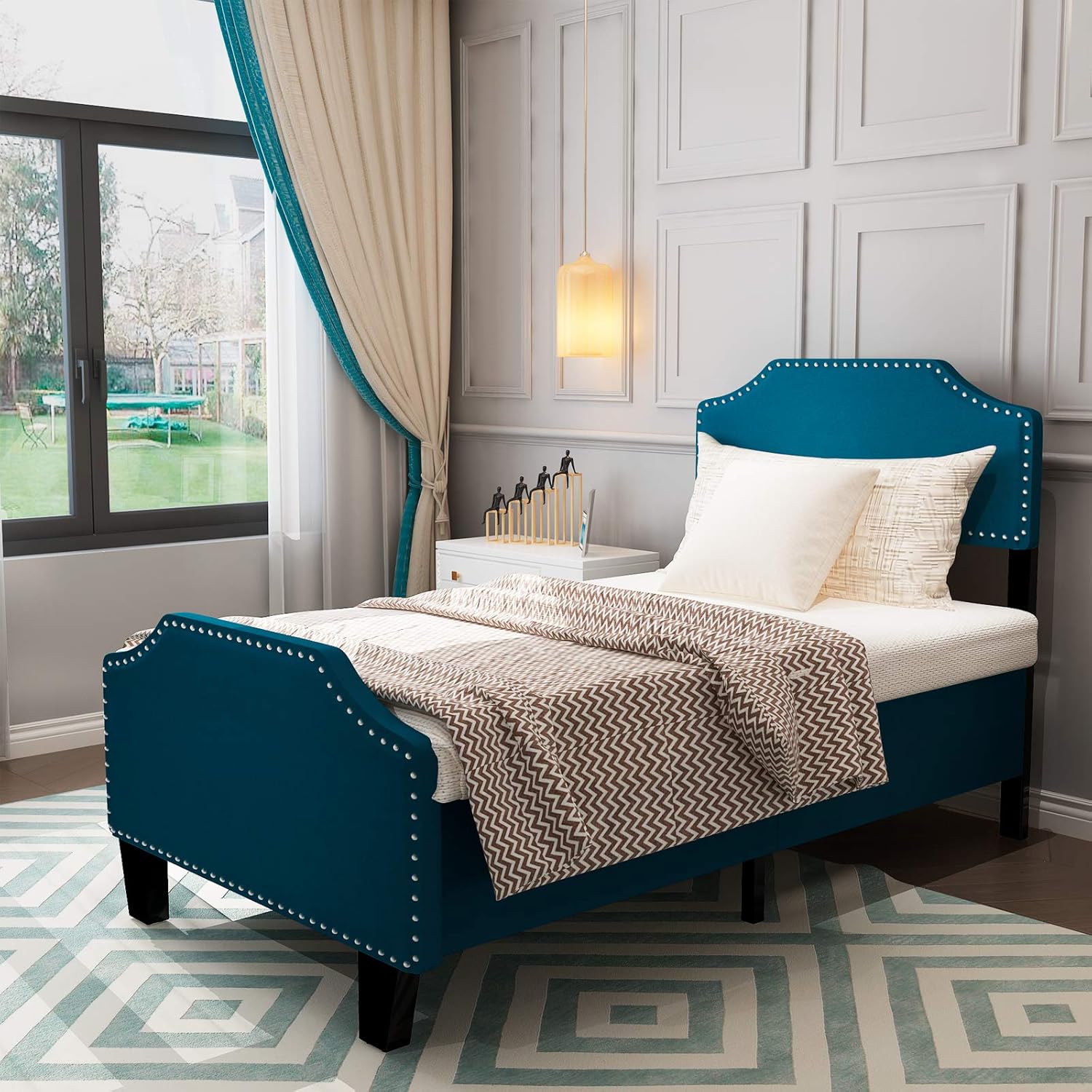 Mecor Upholstered Linen Platform Bed Twin Bed Frame With Curved Headboard Headboard Height Adjustable Nailhead Trim Design Twin Size In Blue Fabric Amazon In Home Kitchen