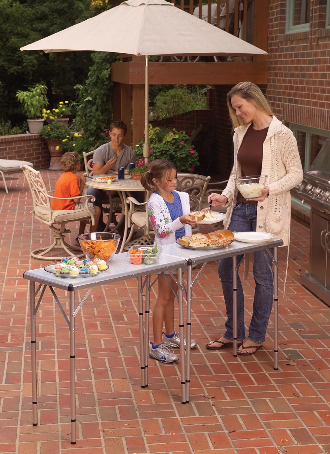 Line them up end-to-end for a backyard BBQ buffet. Adjust one of the tables legs for a bi-level serving station at the tailgate party. The Coleman 4-In-1 Outdoor Table.