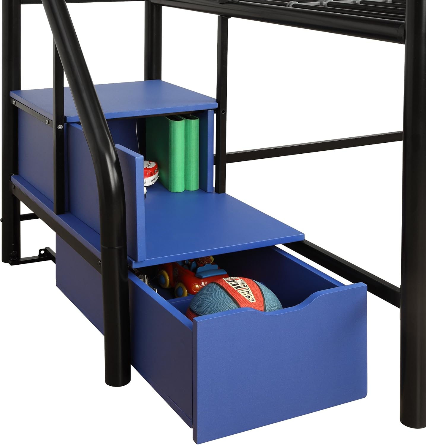 Amazon Com Dhp Junior Twin Metal Loft Bed With Storage Steps Multifunctional Space Saving Solution Black With Blue Steps Furniture Decor