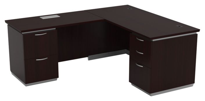 Left L-Shaped Desk with Bow Top. A Target Plus partner. Transitional in style L-Shaped desk This L-shaped desk provides a spacious work area between two pedestals Finished in a rich cappuccino wood stain Brushed nickel square drawer pulls and smooth gliding drawers Eight drawers with two file drawers four task drawers and two narrow center drawers Includes Left Desk and Right Return Right Pedestal Desk Return.