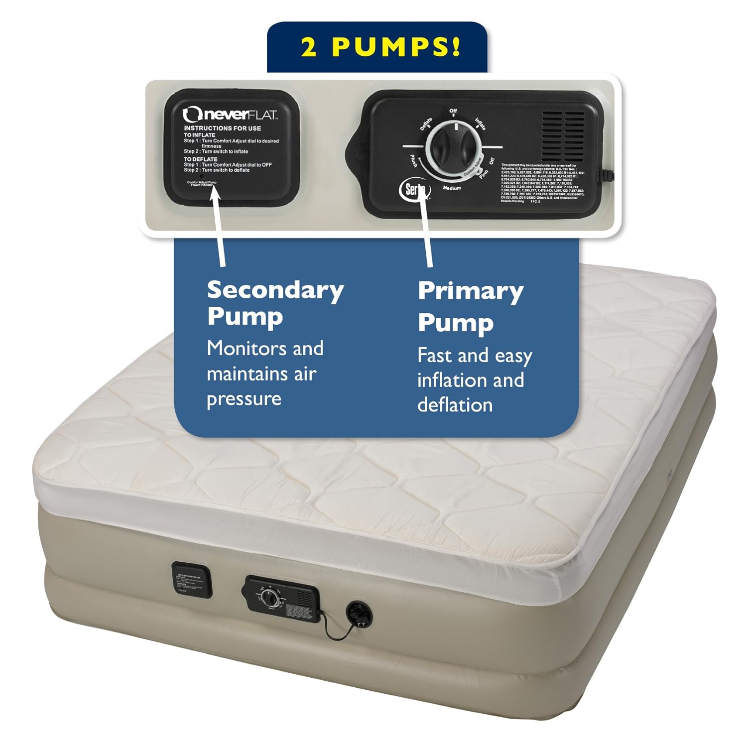 Set your desired comfort level plush medium or firm and our NeverFLAT system monitors air pressure while you sleep engaging a silent secondary pump to keep your comfort settings. Other airbeds can deflate during the night from body weight heat and even pinhole leaks. With Ext Ac Pump.