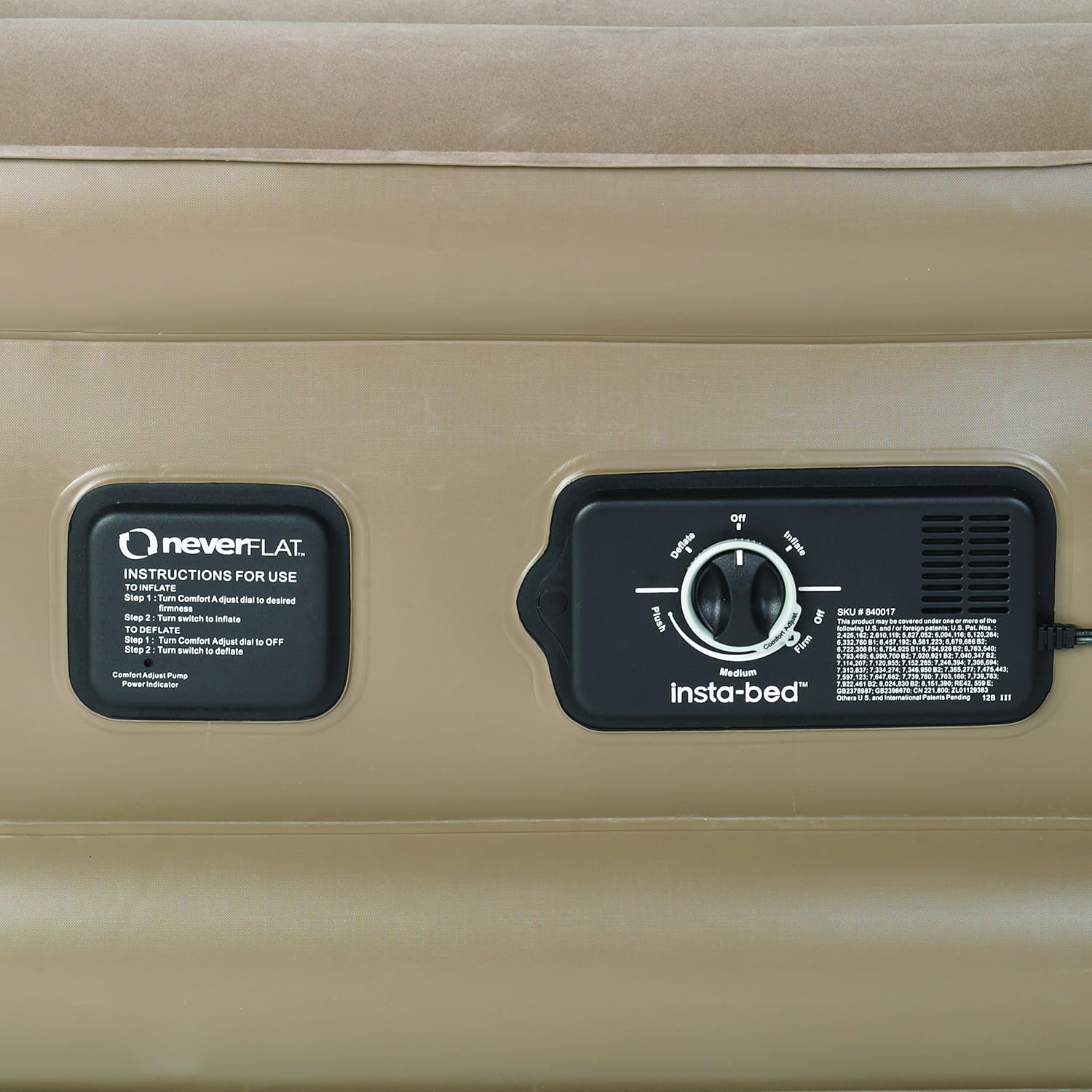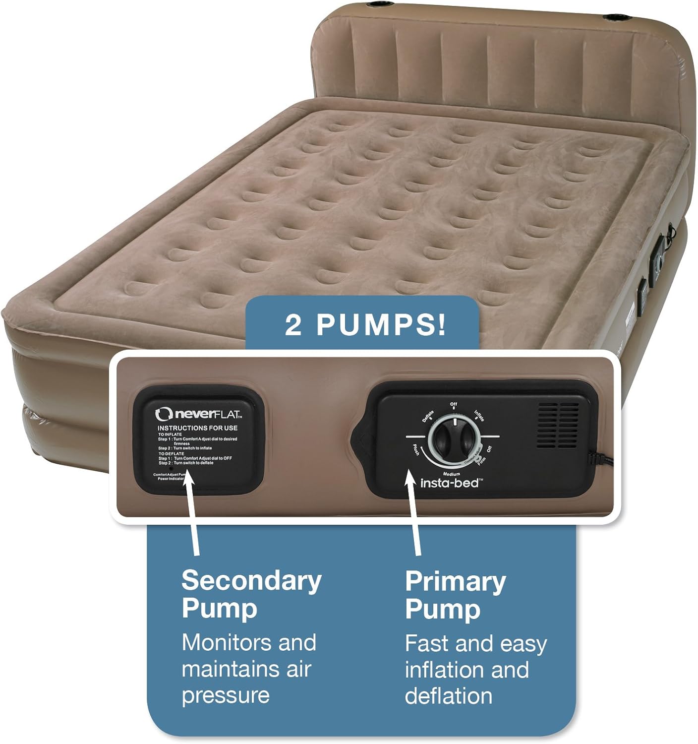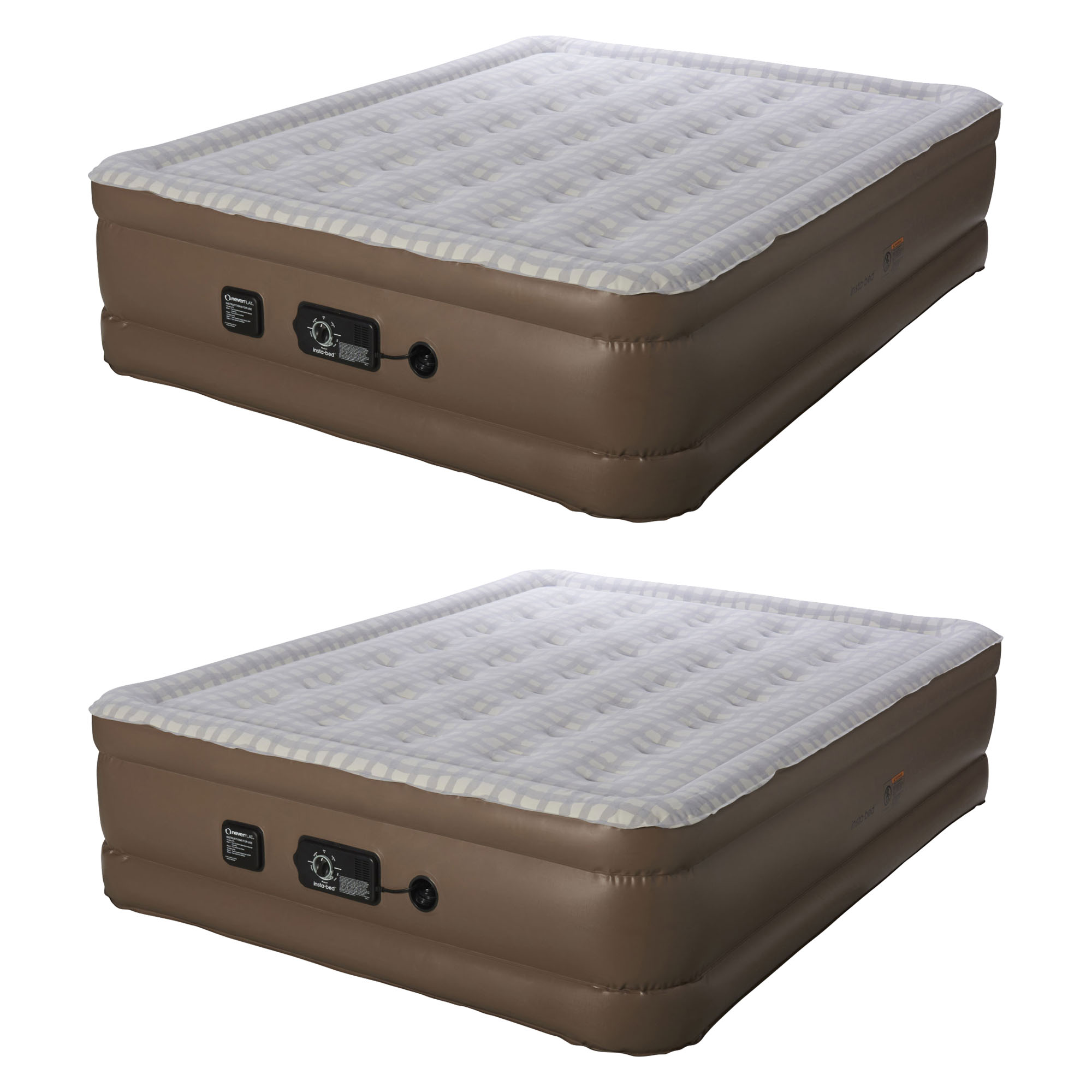 Insta bed neverflat queen raised air bed. Product Overview Combine the convenience of a raised height with our exclusive NeverFLAT pump and you have the ultimate in all-night comfort. Patented powerful internal neverFLAT AC pump inflates and deflates bed quickly Sensors monitor air pressure continuously and engage a silent secondary pump as necessary to maintain a consistent firmness.
