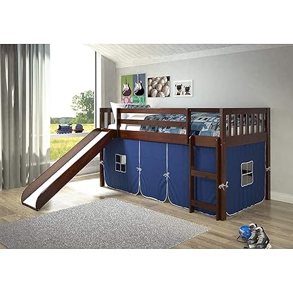 Specializing in Youth Furniture we carry a large selection of Bunk Beds Stairway Bunk Beds Captains Beds Trundle Beds Day Beds. Donco Kids Loft Bed with Slide and Blue Tent Twin Light Espresso. The three step ladder makes it a quick and safe climb for children on this twin low loft bed.